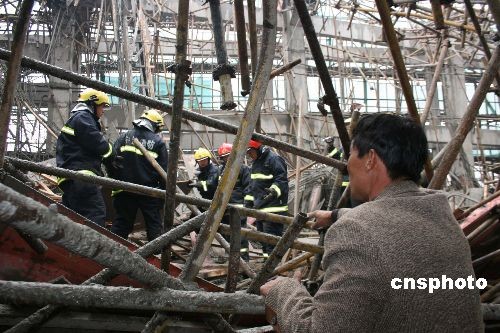 11月23日下午14时39分,位于浙江省宁波市鄞州区下应诚信路888号一厂房内的一施工地发生坍塌。事发时,仓库顶部有12名工人正在施工,其中4人及时自救,7名工人被赶到的消防官兵救出后紧急送医院救治,一人失踪。今天凌晨2点半左右,消防官兵发现遇难者遗体。中新社发 何蒋勇 摄