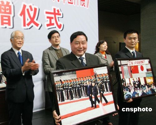 11月25日下午,日本驻重庆总领事馆总领事富田昌宏将《中日友好和平条约缔结暨邓小平访问日本30周年图片展》展品捐赠给广安邓小平纪念园陈列馆。中新社发 杜修战 摄