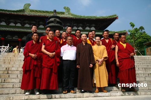 11月25日,日前刚刚在北京获得“拓然巴”高级学衔的11名活佛,在中国藏语系高级佛学院副院长李印平(前排左三)带领下抵达海南,专程前往三亚参访南山寺进行文化交流。 图为11名活佛及李印平和南山寺僧人代表在南山寺前合影留念。中新社发 陈文武 摄