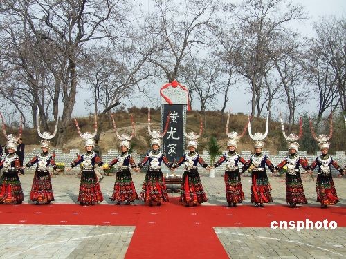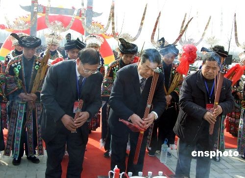 出席二00八中国(阳谷)第二界蚩尤文化研讨会的专家学者及苗族后裔,十一月二十七日在山东省阳谷县蚩尤冢前举行隆重的祭祀蚩尤仪式。中新社发 杨东亮 摄