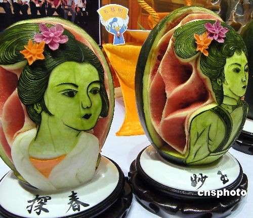 2008年11月27日,上海餐博会中展出用西瓜雕刻而成的《红楼梦》人物脸谱。中新社发 井韦 摄
