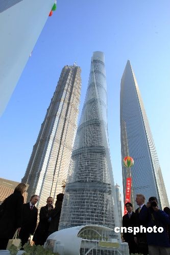 11月29日,中国第一高楼——“上海中心”在上海陆家嘴金融贸易区腹地开工,该超高层建筑总高度将达632米,将与毗邻的超高层建筑“金茂大厦”、“环球金融中心”,形成“三足鼎立”美景,图为开工仪式上,中外嘉宾抢先观赏这一“上海新景观”。据介绍,“上海中心”总投资额预估高达148亿元人民币,外观螺旋造型象征中国和谐的文化精神。预计2012年结构封顶且部分投入运营,2014年竣工交付使用。中新社发 潘索菲 摄