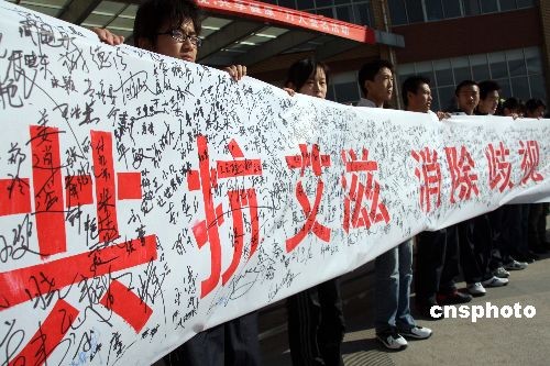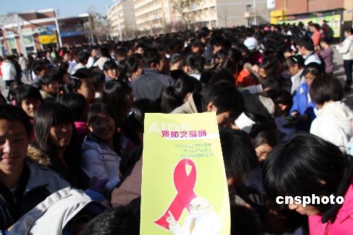 2008年11月28日上午,山东滨州学院大学生举着印有“携手同行,共抗艾滋,消除歧视,共享健康”的条幅。当日,在世界艾滋病日来临前夕,滨州红十字会与滨州学院联合举办了此次签名活动,吸引了学院万余名大学生热情参与。中新社发 郭志华 摄