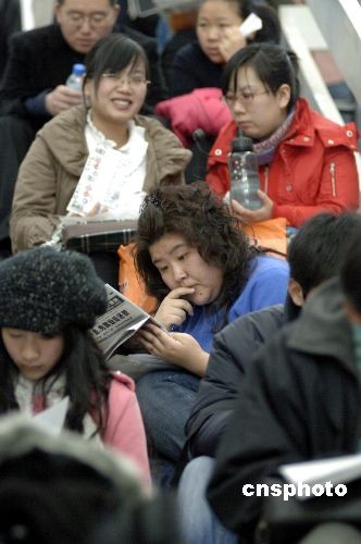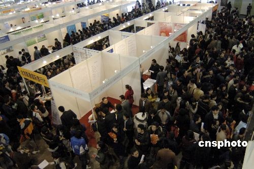 11月29日,大型部委联合招聘会在北京中国国际展览中心举行,中科院、时代集团、中国日报社、百度等700多家单位招揽人才,近万个工作岗位令求职者趋之若骛。据悉,金融危机下的就业形势不容乐观,许多应届毕业大学生主动降低薪酬期望值,以期尽快就业。中新社发 徐曦弋 摄
