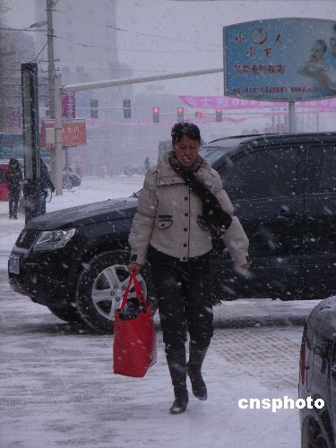 2008年12月3日,齐齐哈尔市再次降雪,城市银装素裹。当地气象台发布蓝色寒潮预警信号,提醒市民做好预防寒潮准备。中新社发 王云龙 摄