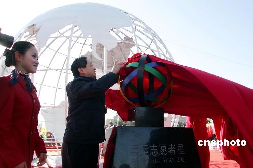 12月5日,北京奥运会后的首个国际志愿者日,奥运志愿者星正式揭幕。 为表彰志愿者为北京奥运会、残奥会的成功举办作出的突出贡献,激励更多人士加入志愿服务行列,经国际天文学联合会小天体命名委员会批准,国际永久编号第18639号小行星被命名为“奥运志愿者星”。中新社发 富田 摄