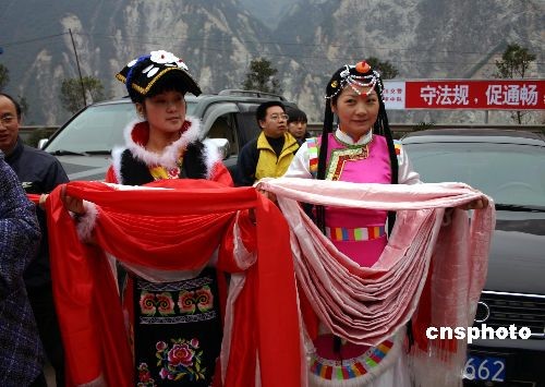 图为映秀羌藏少女盛装向海峡两岸红十字组织代表献哈达。