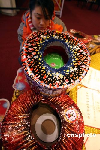 十二月七日晚,北京奥运鸟巢烟花独家生产及燃放实施单位—熊猫烟花推出的“牛”年鸟巢系列烟花,与部分京城市民见面。其中一款“鸟巢”形状的喷花类烟花,立即成为人们关注的焦点。中新社发 任海霞 摄