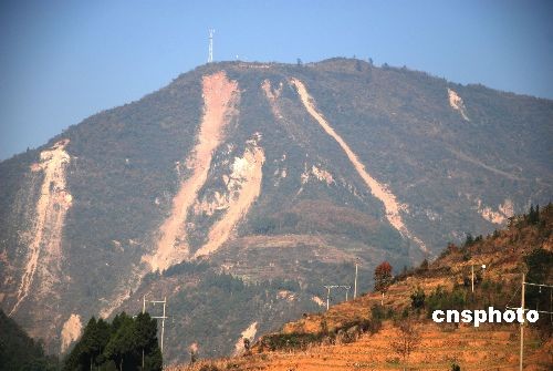 12月,在四川青川县关庄镇的白石河停车场可以清晰地看到远山滑坡体垮出的“青川”二字。中新社发 熊芙蓉 摄