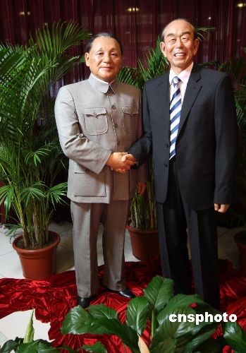 2008年12月10日,邓小平和福田赳夫握手蜡像吸引市民游客驻足观看。近日,一组名为“平福中日,世代之约”的伟人蜡像在北京展出,蜡像的内容为三十年前邓小平与当时的日本首相福田赳夫签订《中日和平友好条约》时的情景。据了解,蜡像预计将在春节前后赠送到日本政府,目前已受到日本媒体的广泛关注。中新社发 吴芒子 摄