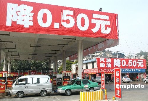 2008年12月12日,随着福州部分中石化加油站开始降低柴油的零售价格,福州一些民营加油站为了吸引更多顾客前来加油,加大降价幅度与中石化竞争。中新社发 张 斌 摄