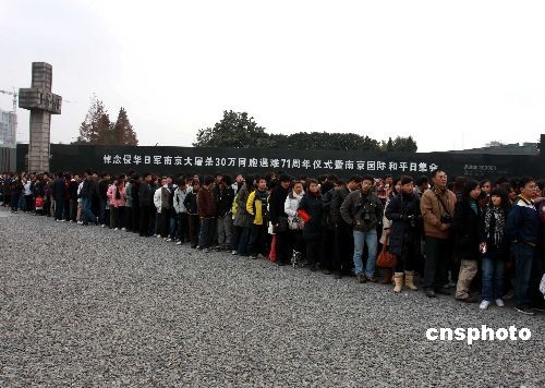 2008年12月13日,南京城上空回荡着防空警报声,整个城市沉浸在历史的悲哀中。每年一次的国际和平集会在南京大屠杀遇难同胞纪念馆举行,悼念南京大屠杀三十万同胞遇难七十一周年。 中新社发 许康平 摄