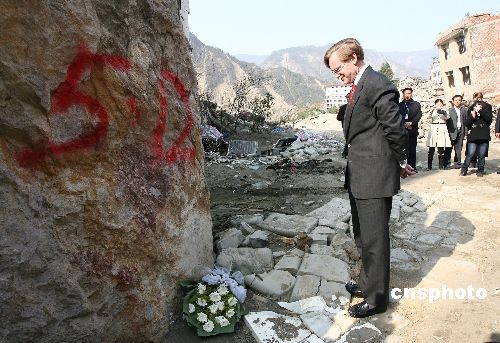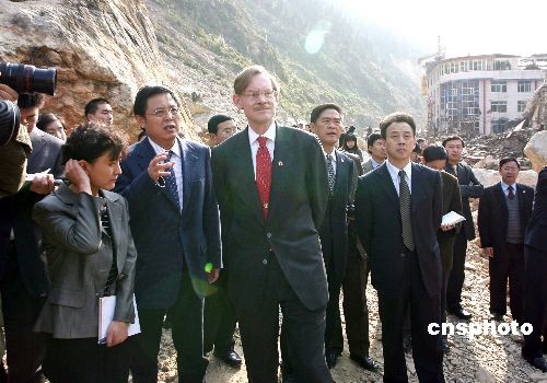 12月14日下午,世界银行行长罗伯特·佐利克(中)在四川省及绵阳市领导陪同下,深入北川地震重灾区北川羌族自治县,视察地震受损和灾后重建进展情况。中新社发 蒲滔 摄