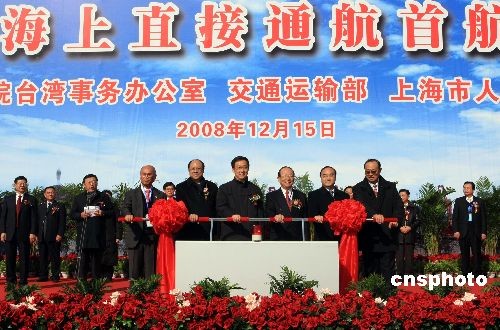 12月15日,海峡两岸海上直接通航首航仪式在上海洋山港举行,中远公司的“远河”号和中海公司的“新非洲”号从洋山港启航执行首航任务。当日,海峡两岸海上、空中直航及直接通邮在两岸同步启动。中新社发 汤彦俊 摄