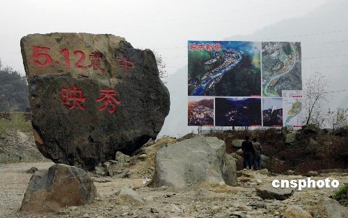 “5·12”8级大地震震中汶川县映秀镇山体滑坡滚下一块巨石,有关部门在巨石上刻字作为地震遗物保护,图右是未来映秀镇未来的规划图。严冬时节,过往行人纷纷留步此间驻足观看映秀的过去和将来。中新社发 肖龙联 摄