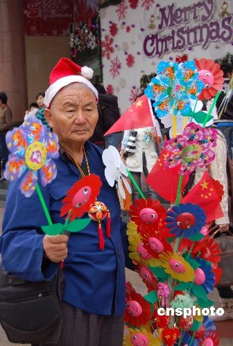 12月21日,随着西方圣诞节临近,广西南宁市街头圣诞气氛渐浓,一位山寨版“圣诞老人”头戴圣诞帽,在街头贩卖圣诞饰品及当地特色饰品绣球等。中新社发 刘万强 摄