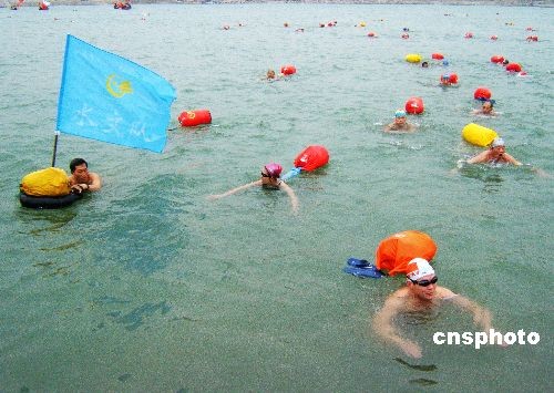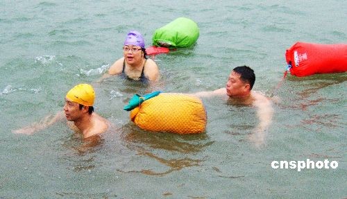 2008年12月21日是二十四节气中的冬至,在湖北宜昌市镇江阁长江段,冬泳健儿在横渡长江。当日下午,宜昌市举办第22届冬季横渡长江活动,264名冬泳健儿挑战严寒成功横渡长江,游程1500米。据悉,宜昌市已连续22年举办冬季横渡长江活动。中新社发 任卫红 摄