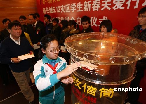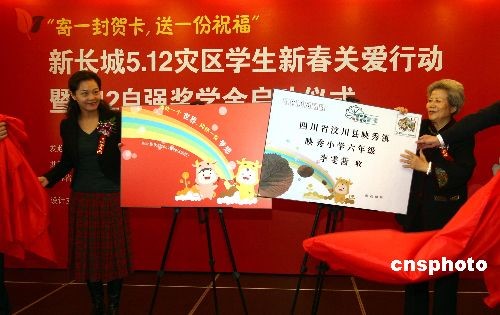 12月22日,“新长城5·12灾区学生新春关爱行动”在北京启动,市民只需花费10元人民币,就可为灾区学生邮寄一枚新年爱心贺卡,其中还包含有为“自强奖学金”捐献的善款。爱心贺卡是由中国扶贫基金会与北京市邮政公司联合特别发行的,且邮资封上已经印有小学生名址,捐购贺卡的爱心人士只要写上自己的祝福,就能直接邮寄出去。中新社发 杜洋 摄