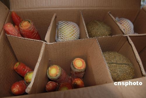 12月23日,赠台大熊猫“团团”、“圆圆”离开雅安碧峰峡前往成都双流国际机场。台湾人民期盼已久的“团团”、“圆圆”,终于踏上了赴“宝岛”台湾之路。图为大熊猫途中所用食物。中新社发 陈学梅 摄
