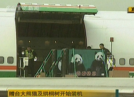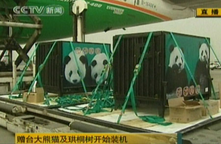 赠台大熊猫“团团”、“圆圆”23日飞赴台湾。大陆有关部门在成都双流机场举办“赠台大熊猫及珙桐树赴台欢送仪式”,目前仪式已结束,开始装运大熊猫和珙桐树。
