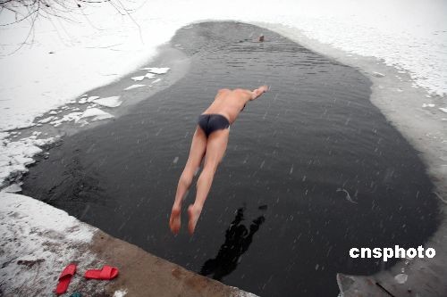 12月下旬,沈阳市北陵公园人工湖,一批冬泳爱好者换上泳衣,在刺骨的寒风中面对泛着冰碴的湖水一跃而下演绎出美丽“冻”人的一幅画面。一名老冬泳爱好者告诉记者,冬泳开始练习时难免有些困难要克服,但克服困难后的乐趣是普通人无法体会的,“希望更多的年轻人加入到这个队伍中,可以锻炼我们整个民族的意志。”中新社发 黄金昆 摄