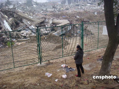 2009年元旦节,四川大地震极重灾区的北川县曲山镇一位母亲,清晨到北川中学地震遗址上香,悼念在此失去生命的儿子。中新社发 贾国荣 摄