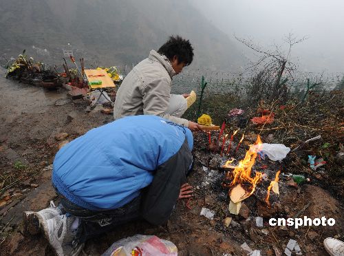 几位北川中学的幸存学生2009年即将毕业,他们在新年节假日来到北川县城废墟外的望乡台,遥祭被四川大地震摧毁的北川中学上千名遇难师生和亲人们。中新社发 贾国荣 摄