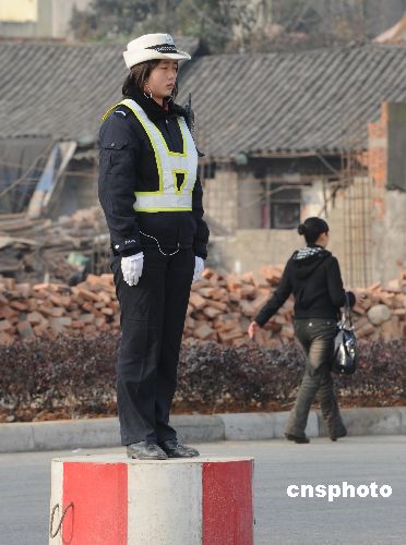 一名女警在四川大地震重灾区的北川县安昌镇街头上岗指挥交通。北川县城被大地震摧毁后,县机关转移此地办公,将于2009年春节后开始新北川城的建设。中新社发 贾国荣 摄