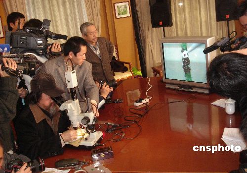 1月6日,成都大熊猫基地,微雕大师郭月明(图左头戴帽子者)现场表演在熊猫毛上雕刻熊猫的绝技,放大的显示屏吸引众多媒体人聚焦。图为最后画龙点“睛”之笔,为熊猫点上眼睛的一刻。中新社发 魏姝 摄