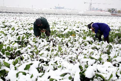 1月6日,湖北省枝江市市民正在采摘蔬菜。据气象部门发布的信息表明,5日至6日,湖北省的西部地区普降中雪,省政府办公厅已下发紧急通知,要求各市、州、县人民政府,省政府有关部门认真做好应对低温冻害工作。中新社发 柳月 摄