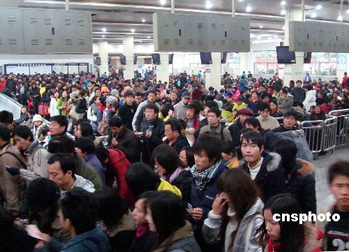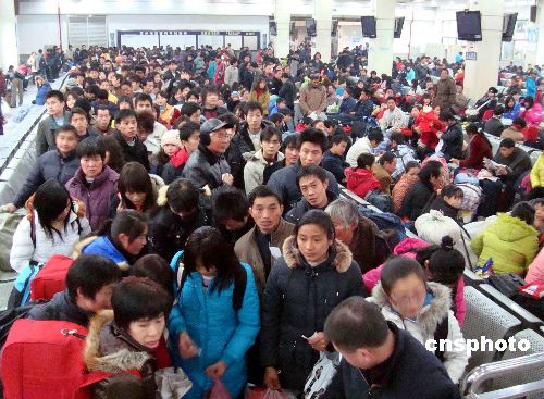2009年1月6日,许多旅客在苏州火车站候车厅候车。近日,随着新春佳节临近,苏州火车站客流量明显增加,不少在苏州的农民工纷纷返乡,苏州火车站提前迎来农民工返乡客流高峰。中新社发 王建康 摄