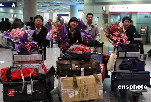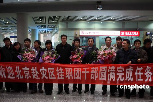 一月七日,四位赴四川汶川地震的团干部返京。自5.12四川汶川地震发生后,北京市共派出十九批二百六十余名志愿者等奔赴灾区,与当地民众并肩奋战。中新社发 任海霞 摄