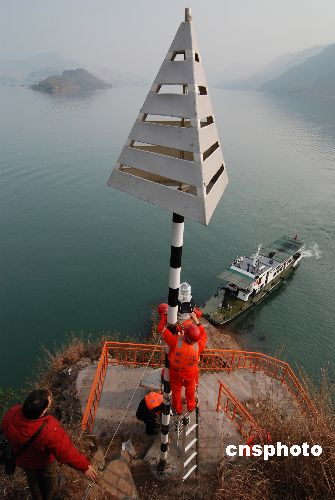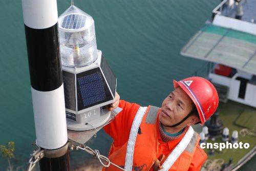 2009年1月8日,在三峡重庆库区云阳段,航道管理人员在安装新型太阳能航标灯。这种航标灯集太阳能光板、蓄电池、灯具于一体,视距更长、灵敏度更高、耐用性更好,可有效解决三峡库区江面增宽和雾气较大给船舶航行带来的影响。目前,三峡库区航道管理部门正在陆续更换,仅云阳县就有30只新型太阳能航标灯在春运期间投入使用。中新社发 刘小洋 摄