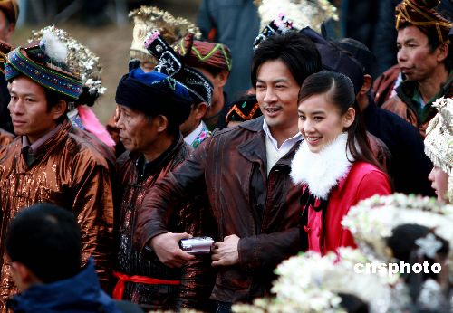 1月7日,在广西融水苗族自治县四荣乡田头苗寨,知名艺人黄圣依、苏有朋在拍戏中。近日,《寻找刘三姐》电影剧组来到广西融水县田头苗寨拍摄外景戏,黄圣依和苏有亦现身大苗山,出演剧中主要人物。据了解,电影《寻找刘三姐》由广西电影制片厂等单位联合出品,由黄圣依、苏有朋主演。中新社发 龙涛 摄