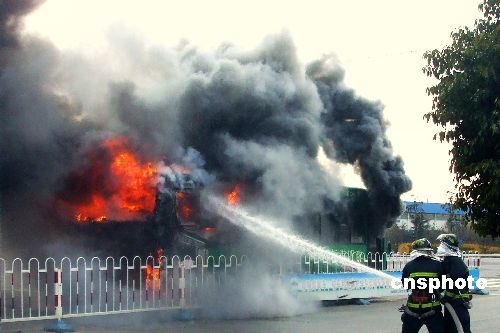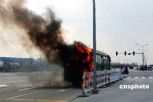 2009年1月9日下午两时,江苏盐城市区一20路公交车行驶到盐渎路与西环路交界处发生自燃,当时车内有七八名乘客,由于疏散及时,并没有造成人员伤亡,火也被消防人员及时扑灭,车辆却受损严重,公交部门初步断定起火原因是电路故障。中新社发 李根 摄