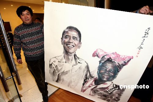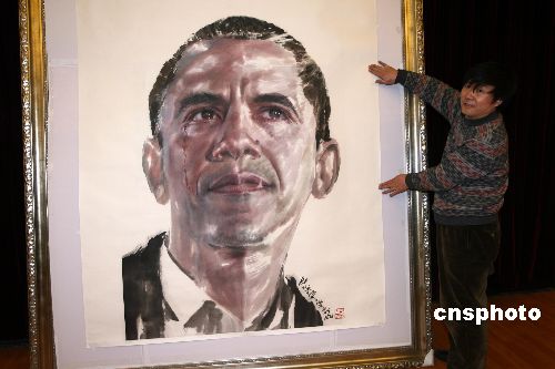 1月20日,中国著名画家于成松大型中国画《朗朗青空》在北京与观众见面。作品以奥巴马为原型,图中奥巴马面挂激动的泪花,头微微仰望远方。于成松说,想通过创作该幅作品,加深中美两国人民的了解和友谊。画家同时创作了以奥巴马和他的肯尼亚奶奶为原型的作品《盈盈厚土》。中新社发 杜洋 摄