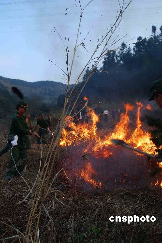 1月20日,武警福建总队三明支队官兵在奋力扑火。当日下午16时左右,福建三明市梅列区洋溪乡羊口仔村后山由于村民野外用火不慎引起山林大火。驻在附近的武警三明支队100多官兵经过1个多小时的奋力扑救,终将山火扑灭。中新社发 卢立杰 摄