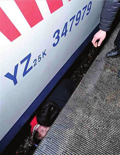 20日下午,列车员正在救助不慎跌落站台的女童。当天,在北京西站,一列开往西安的T231次火车即将发车,一名女童在随父母奔跑赶车过程中,不慎从站台与列车之间的缝隙跌到列车底下。列车员闻讯后迅速赶到现场,将受惊吓的女童救出。(郭莎莎摄)