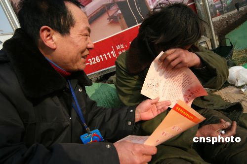 1月22日,许昌市救助管理站的工作人员在救助一个生活无着人员。春节即将到来,为更好地向困难群体献爱心、送温暖,不让一个生活无着人员流落街头,当日,河南省许昌市救助管理站开展“迎新春社会关爱生活无着人员”活动,对符合救助条件的求助者,无偿提供食宿、帮助联系亲属等。这次活动除与各区县救助站同时开展宣传、咨询活动外,还会派流动小分队走上街头,对生活无着人员进行劝导,实施现场救助。中新社发 牛书培 摄