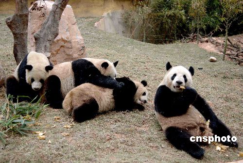 1月23日,广州香江野生动物世界又一力作——长隆大熊猫中心顺利落成并投入使用。十只大熊猫乔迁新居,大熊猫在新居的室外活动场地欢乐嬉戏。中新社发 刘卫勇 摄
