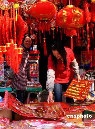 1月22日,广西桂林商业步行街,市民在挑选年货,选购新年饰品。春节临近,桂林各大商场货源充足,购销两旺,洋溢着浓浓的节日气氛。中新社发 姜纯 摄