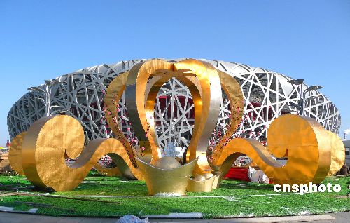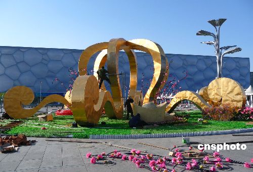 2009年1月23日,北京奥林匹克中心区,工作人员在“鸟巢”、“水立方”之间布置一个巨大的“祥云皇冠”造型景观,迎接新春佳节到来。中新社发 玉龙 摄