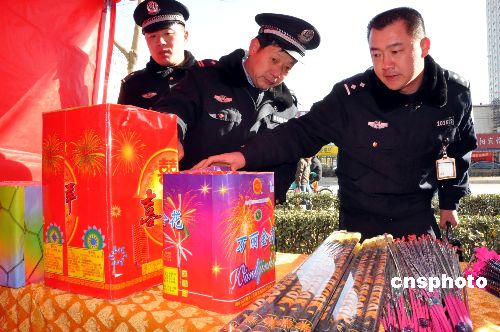 1月23日,为确保春节安全,郑州市公安局金水分局组织治安、消防大队、辖区派出所,全面展开对烟花爆竹违规燃放、贩运和销售烟花进行严格检查。截至目前,共清查集贸市场、街道乡村摊点317余处。中新社发 刘书亭 摄