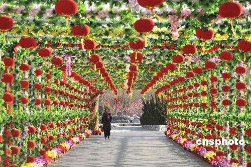2009年1月24日,莲花池公园内用灯笼搭建的拱形长廊。经过精心筹备,京城30多个传统庙会已经准备就绪。中新社发 樊甲山 摄