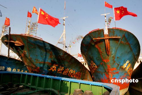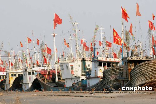 2009年1月25日,江苏赣榆沿海渔港披上节日盛装,数千条停泊的渔船挂满了国旗,庆祝新年的到来。中新社发 司伟 摄
