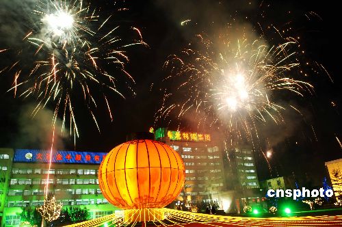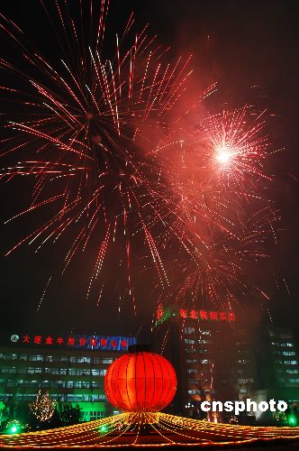 1月25日除夕夜,东北特钢集团大连基地广场五彩缤纷礼花绽放空中,迎接牛年到来。当晚,大连市大街小巷爆竹声声,人们在绚烂的烟花中迎来2009农历新年。中新社发 刘德斌 摄