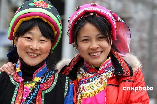 1月26日农历牛年第一天,5·12地震重灾区四川省北川县擂鼓镇羌族女中学英语教师谢红霞(左)穿上民族节日盛装到各个羌族村寨看望她的学生和家长。去年地震发生时,谢红霞与全体教师沉着镇静地将所有学生保护到安全地带,学生与家长们由衷地感谢这些教师。中新社发 任晨鸣 摄