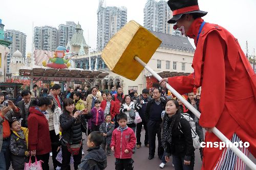 一月二十六日,中国农历大年初一,深圳欢乐谷、世界之窗、红树林海滨公园、东部华侨城等旅游景区游人如织。图为深圳欢乐谷滑稽演员与游客同乐。中新社发 陈文 摄