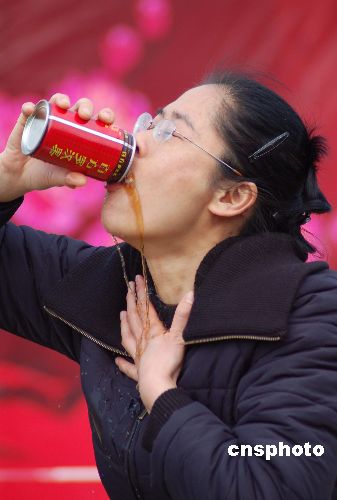 1月27日,牛年大年初二,广西南宁青秀山景区内一饮料商家举行“牛人”“牛饮”大赛,参赛者在规定时间内喝掉最多饮料者获胜,众多游客参加“牛饮”,欲赢取奖品。中新社发 刘万强 摄