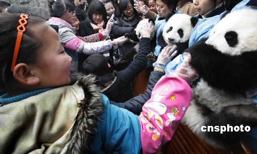 1月17日,中国农历大年初二,来自都江堰的十七名因汶川大地震新增的“三孤”人员,受邀来到成都大熊猫繁育研究基地:参观大熊猫产房、品尝大熊猫专用“窝头”、和大熊猫亲密接触合影留念……度过了一个独具意义的春节。图为孩子们与大熊猫亲密接触。中新社发 张全能 摄